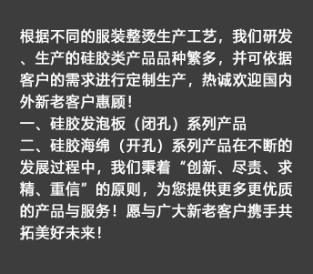 我公司生產(chǎn)的硅膠海綿(開孔)系列產(chǎn)品具有耐高溫、透氣性好、耐壓性強等優(yōu)點,是西服及高檔服裝整燙生產(chǎn)的必備產(chǎn)品。硅膠發(fā)泡板(閉孔)系列產(chǎn)品具有發(fā)泡均勻,耐高溫、耐壓性能好,其中新研制開發(fā)的針孔浮點硅膠發(fā)泡板攻克了一般產(chǎn)品的浮點不飽滿的技術難題,一般產(chǎn)品的浮點不飽滿,容易擋住透氣孔,造成吸風效果不良。我司的產(chǎn)品具有更好的透氣性和回彈性,以及更長時間的試用壽命。
